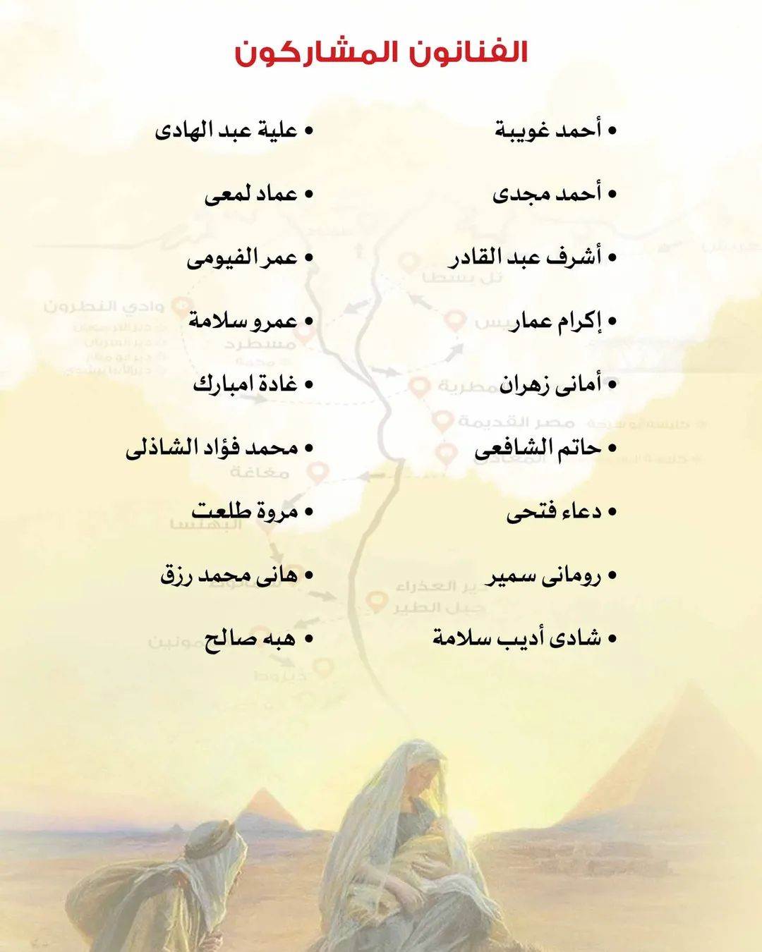 ويقدم الفنانون المشاركون 30 عملاً من النحت والتصوير الزيتى والاكريليك والباستل يصور رحلة العائلة المقدسة، وهم: أحمد غويبة، أحمد مجدي، أشرف عبدالقادر، إكرام عمار، أماني زهران، حاتم الشافعي، دعاء فتحي، روماني سمير، شادي أديب سلامة، علية عبدالهادي، عماد لمعي، عمر الفيومي، عمرو سلامة، غادة امبارك، محمد فؤاد الشاذلي، مروة طلعت، هاني محمد رزق، هبة صالح، ويعد المعرض الفنانة الدكتورة نجاة فاروق المشرف على إدارة الفنون التشكيلية بالصندوق.
