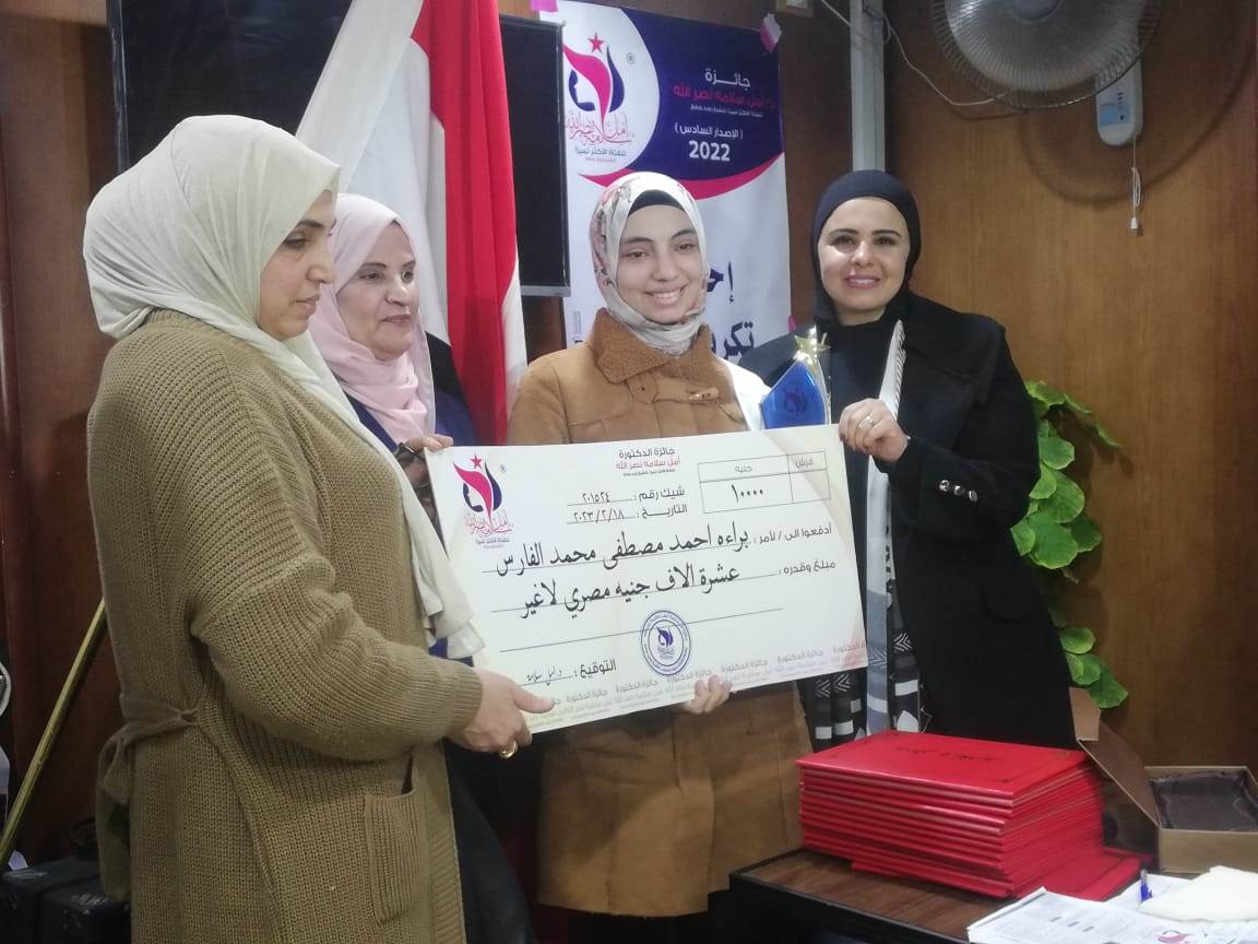 فازت بالمركز الأول للجائزة في العام الحالي كل من: الطالبة نور ازويد الطالبة بكلية الطب البشري بجامعة العريش (بالمركز الأول)، الطالبة براءة أحمد مصطفى الطالبة بكلية الطب البشري بجامعة العريش (المركز الثاني)، الطالبة نعمة محمود عامر الطالبة بكلية التربية بجامعة العريش ( بالمركز الثالث).. كما كرمت الجائزة ١٤ طالبة من المشاركات هذا العام بمبلغ مالي وشهادة تقدير.