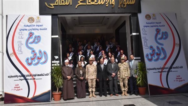 شهدت جامعة أسيوط انطلاق وقائع الندوة التثقيفية الثامنة والثلاثين، التي تنظمها قوات الدفاع الشعبي والعسكري بعنوان «درع الوطن» في رحاب جامعة أسيوط، والتي شهدت حضور اللواء وليد حامد الحماقى قائد قوات الدفاع الشعبى والعسكرى، والدكتور أحمد المنشاوى رئيس جامعة أسيوط، والدكتورة مها غانم نائب رئيس الجامعة لشؤون خدمة المجتمع وتنمية البيئة، والدكتور أحمد عبدالمولى القائم بعمل نائب رئيس الجامعة لشؤون التعليم والطلاب والدكتور محمد عبدالمالك نائب رئيس جامعة الأزهر للوجة القبلى، وحشد من القيادات العسكرية والأمنية والشعبية والتنفيذية بالمحافظة وأعضاء مجلس الجامعة، ورجال الدين والإعلام، وقيادات العمل الأكاديمى والإداري والأنشطة الطلابية بالجامعة وأعضاء اتحاد طلاب الجامعة.