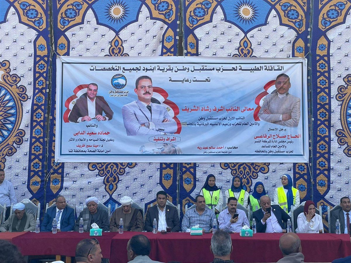 تفقد المهندس أشرف رشاد، النائب الأول لرئيس حزب مستقبل وطن الأمين العام، وزعيم الأغلبية البرلمانية، القافلة الطبية الشاملة التي تنظمها أمانة الحزب بقنا بناحية الجبلاو، وبقرية أبنود.