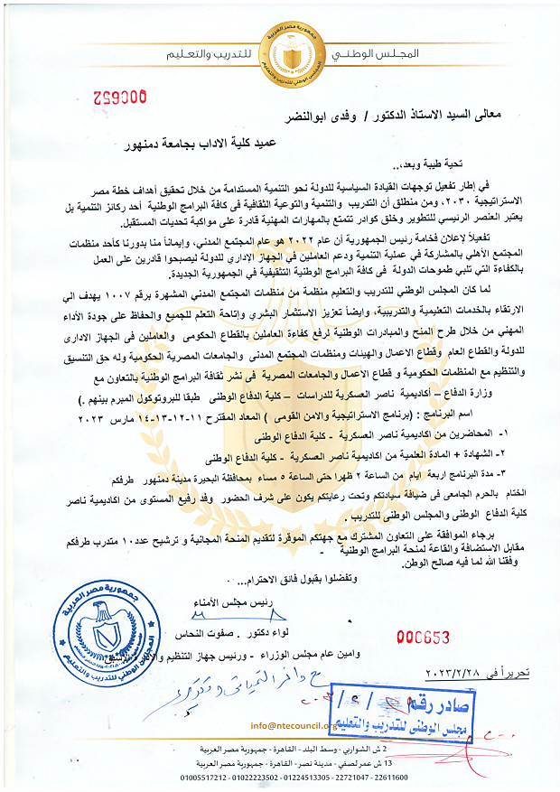 أعلن الدكتور وفدى أبو النضر عميد كلية الآداب بجامعة دمنهور، عن تنظيم دورة المجلس الوطني للتدريب والتعليم بالشراكة مع أكاديمية ناصر العسكرية للدراسات العليا "كلية الدفاع الوطني"، بالتعاون مع جامعة دمنهور، مؤكدًا بدء التسجيل في دورة الدراسات الأستراتيجية والأمن القومي المقرر عقدها من يوم 11 مارس 2023 بحضور فعلي بمدينة دمنهور لكل من القيادات وموظفي وزارات وأجهزة الدولة وأساتذة الجامعات والنقابات العمالية.