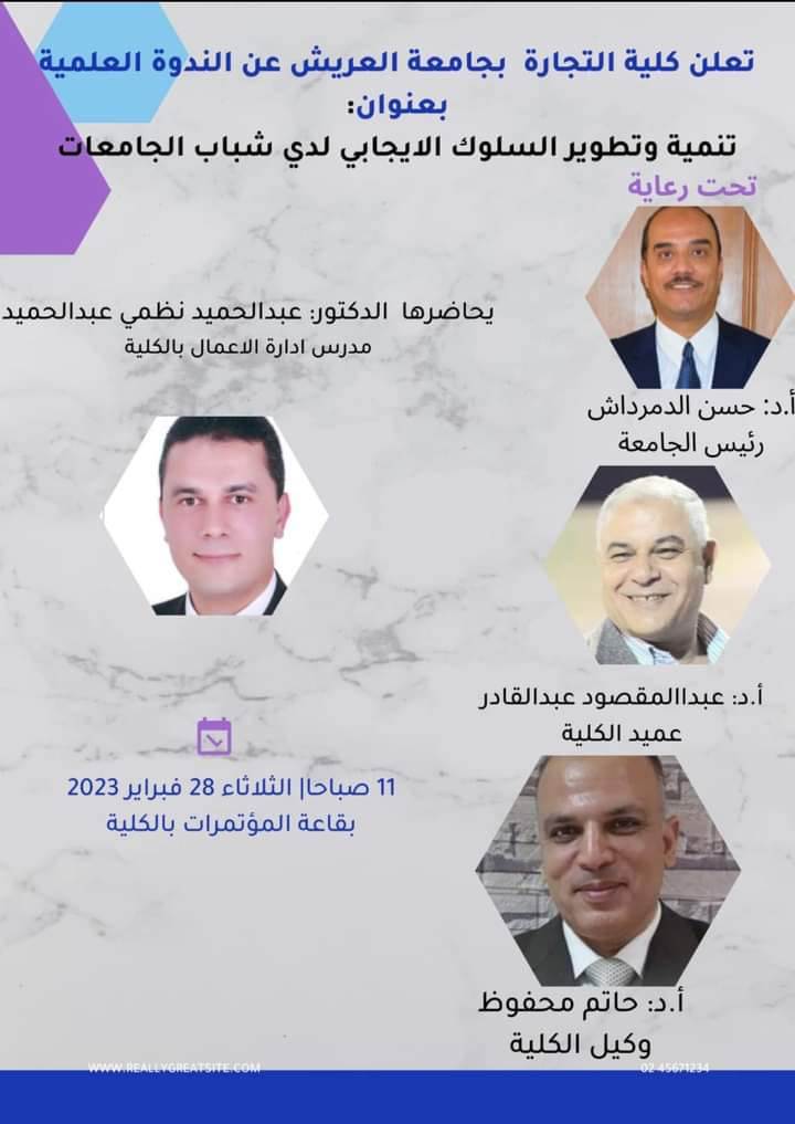 نظمت كلية التجارة بجامعة العريش ندوة تحت عنوان: "تنمية وتطوير السلوك الايجابى لدى شباب الجامعات"، وذلك تحت رعاية الدكتور حسن عبدالمنعم الدمرداش رئيس جامعة العريش والدكتور عبدالمقصود عبدالقادر سليمان عميد الكلية.