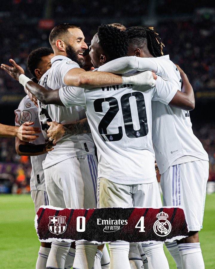 افتتح فينسيوس جونيور التسجيل بهدف في شباك برشلونة عند الدقيقة 45+1، ونجح كريم بنزيما مهاجم الريال في تسجيل ثلاثة أهداف "هاتريك" عند الدقيقة 50 والهدف الثاني عند الدقيقة 58 من ضربة جزاء، والهدف الثالث عند الدقيقة 80 من عمر اللقاء.