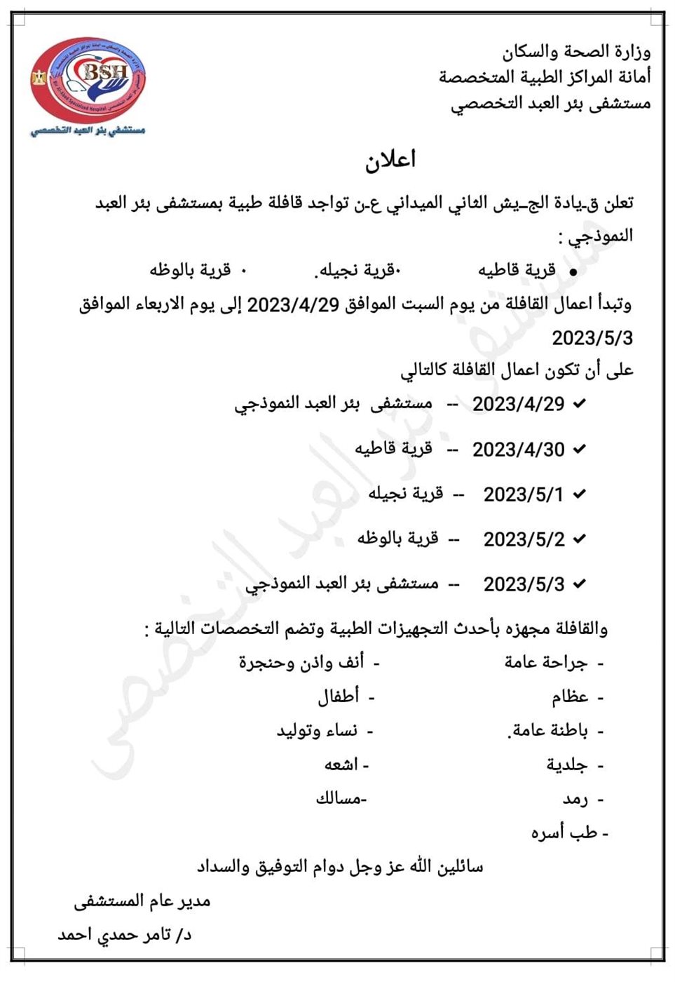 أعلن مستشفى بئر العبد النموذجى بشمال سيناء تنفيذ قافلة طبية تضم عددا من التخصصات الطبية في بئر العبد اعتبارا من غد حتى يوم الأربعاء المقبل لتوقيع الكشف الطبي على المواطنين وصرف العلاج بالمجان.