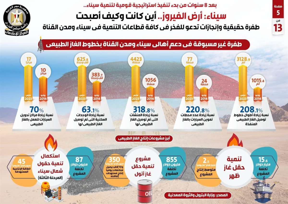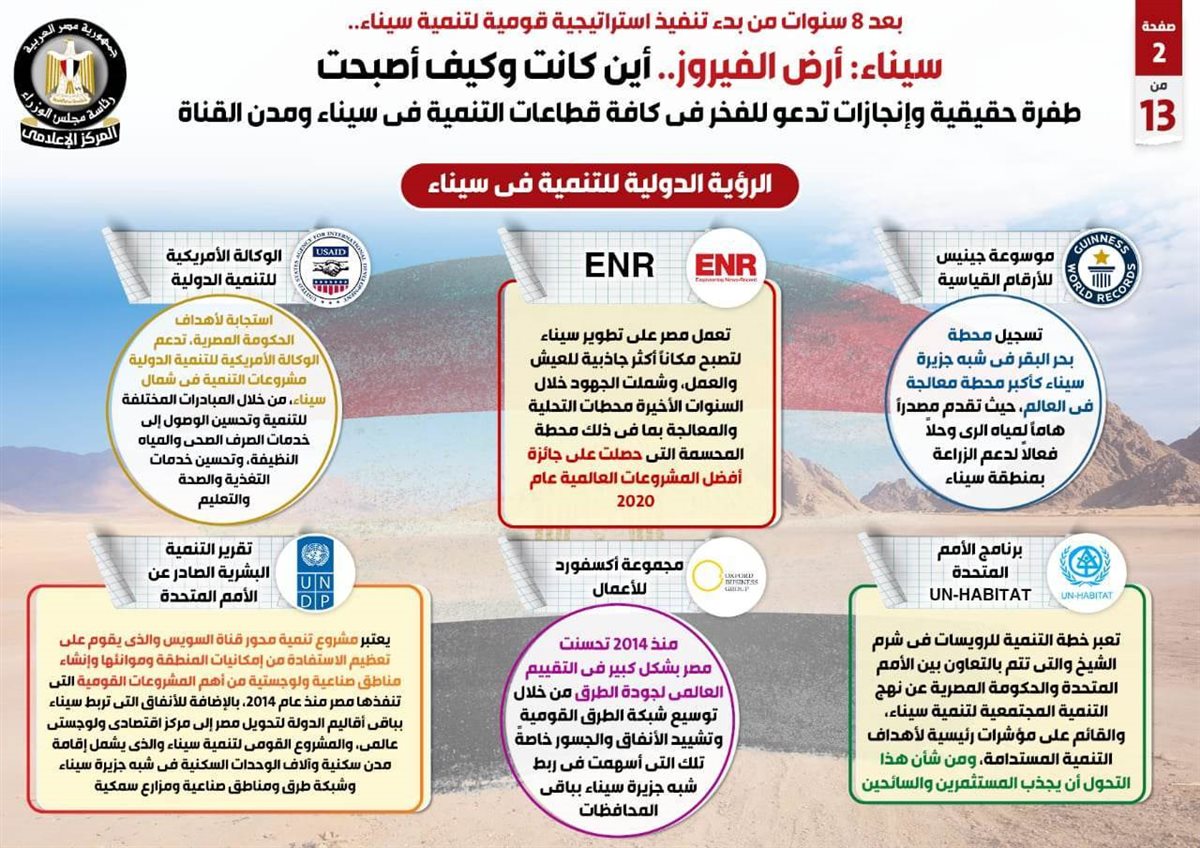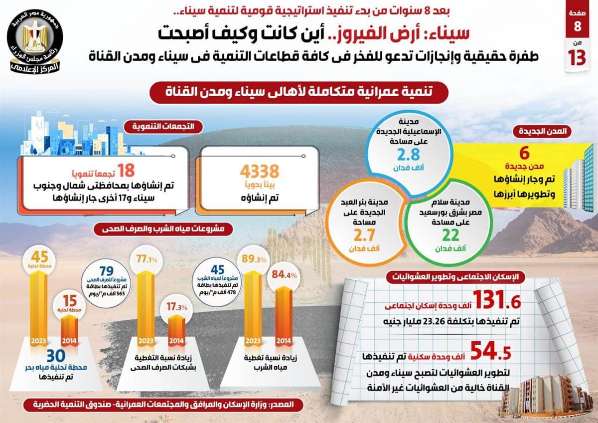 وفي هذا الصدد، نشر المركز الإعلامي لمجلس الوزراء تقريراً يتضمن إنفوجرافات بعنوان سيناء أرض الفيروز.. أين كانت وكيف أصبحت، لتسليط الضوء على الطفرة الحقيقية والإنجازات في كافة قطاعات التنمية في سيناء ومدن القناة بما يدعو للفخر، وذلك بعد 8 سنوات من بدء تنفيذ استراتيجية قومية لتنمية سيناء.