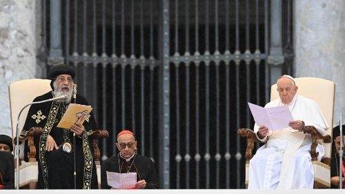 ومن جهته وجه قداسة البابا فرنسيس التحية والشكر لقداسة البابا تواضروس على قبول دعوته للمجيء إلى الڤاتيكان للاحتفال بالذكرى الخمسين للقاء التاريخي بين البابا بولس السادس والبابا شنودة الثالث في ١٠ مايو عام ١٩٧٣، مشيرًا إلى الإعلان الكريستولوجي المشترك الذي تم توقيعه خلال ذلك اللقاء. كما وذكَّر بلقائه الأول مع قداسة البابا تواضروس الثاني في اليوم ذاته منذ عشر سنوات مضت وباقتراح قداسة البابا تواضروس بالاحتفال في هذا اليوم من كل عام بيوم المحبة الأخوية الذي صرنا نحتفل به كل عام، ويجرى اتصال هاتفي في هذا اليوم بين الباباوين.
