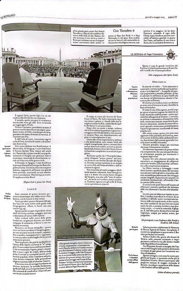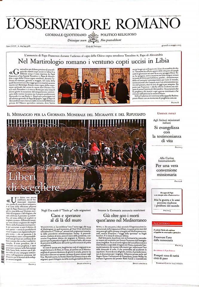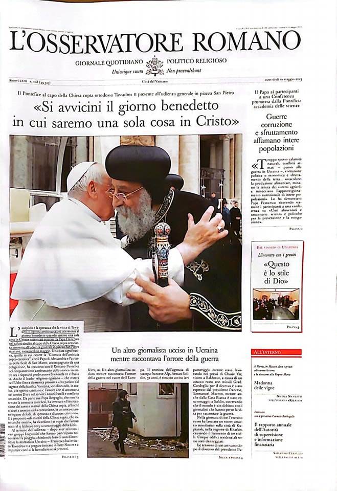 تصدر زيارة قداسة البابا تواضروس الثاني بابا للڤاتيكان عناوين صحيفة L'osservatore romano وهي الصحيفة الرسمية لكرسي روما.