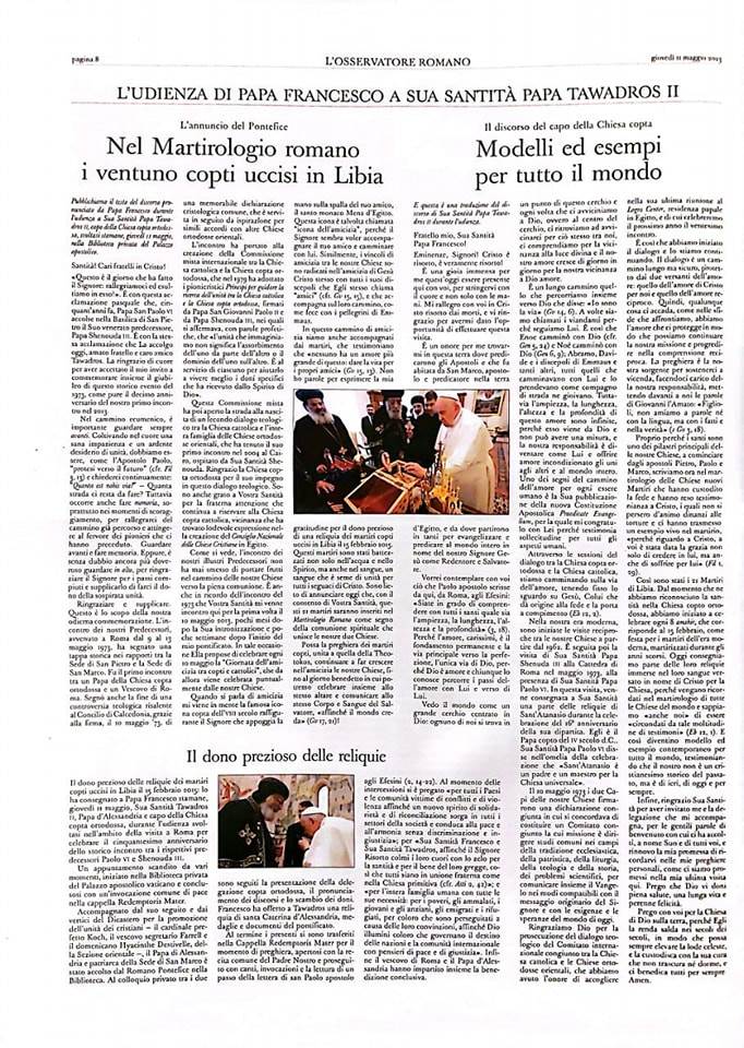 - مقابلة قداسة البابا فرنسيس مع قداسة البابا تواضروس: "أمثلة ونماذج للعالم كله". - إدراج الشهداء الأقباط الواحد والعشرين الذين استشهدوا في ليبيا في سنكسار كنيسة روما".