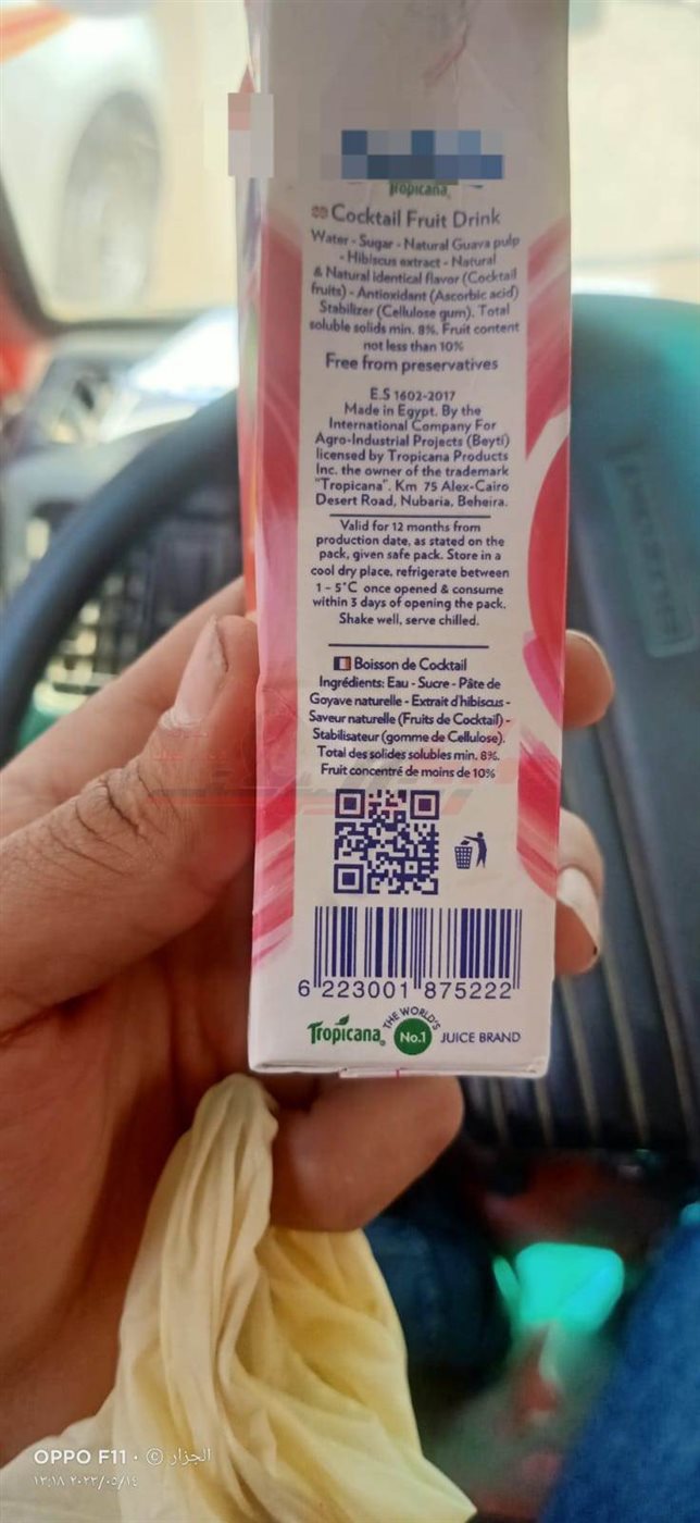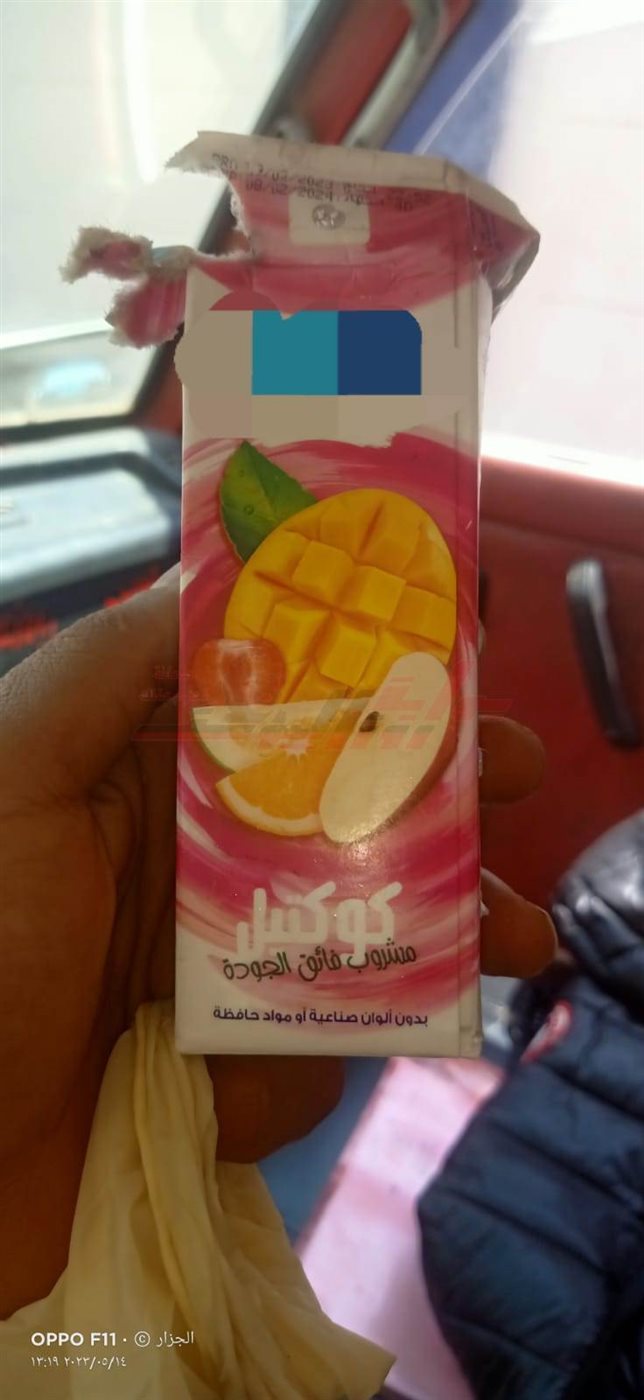 تلقى اللواء نبيل سليم مدير أمن القليوبية، إخطارا من مأمور قسم شرطة ثان شبرا الخيمة، يفيد بتلقيه بلاغا من صلاح ابراهيم على ابوزيد، مقيم سرياقوس مركز الخانكة، أثناء تعرضه للكشف الطبي بمستشفى افرينو بدائرة قسم ثان شبرا الخيمة ضمن اجراءات ترخيص سيارته، ذهب لكشك مجاور للمستشفى لشراء عصير، وأثناء تناوله لاحظ تغير الطعم وبفتح العبوة تبين أنها بها جسم غريب غير محدد ذات لون اسود رغم ان الصلاحية سارية ومدون على العبوة إنتاج 9 / 2 / 2023 وانتهاء 8 / 2 / 2024 .