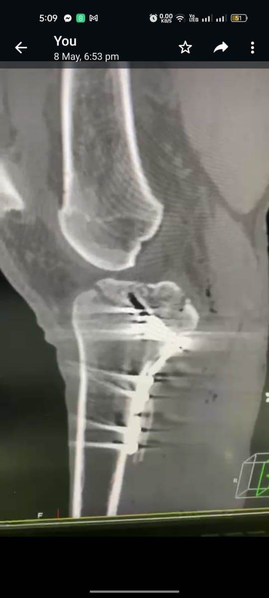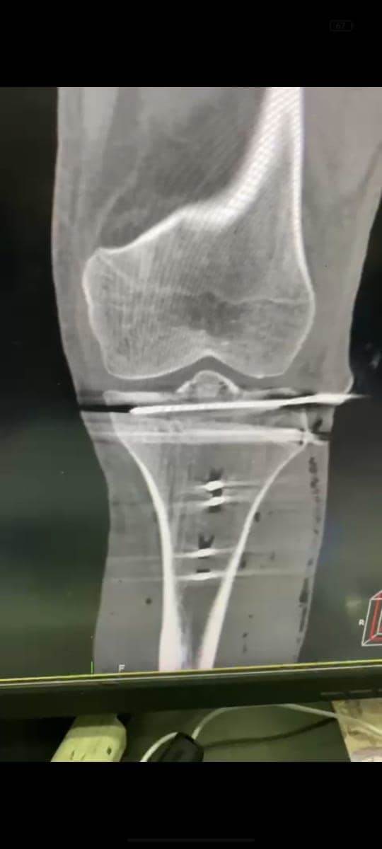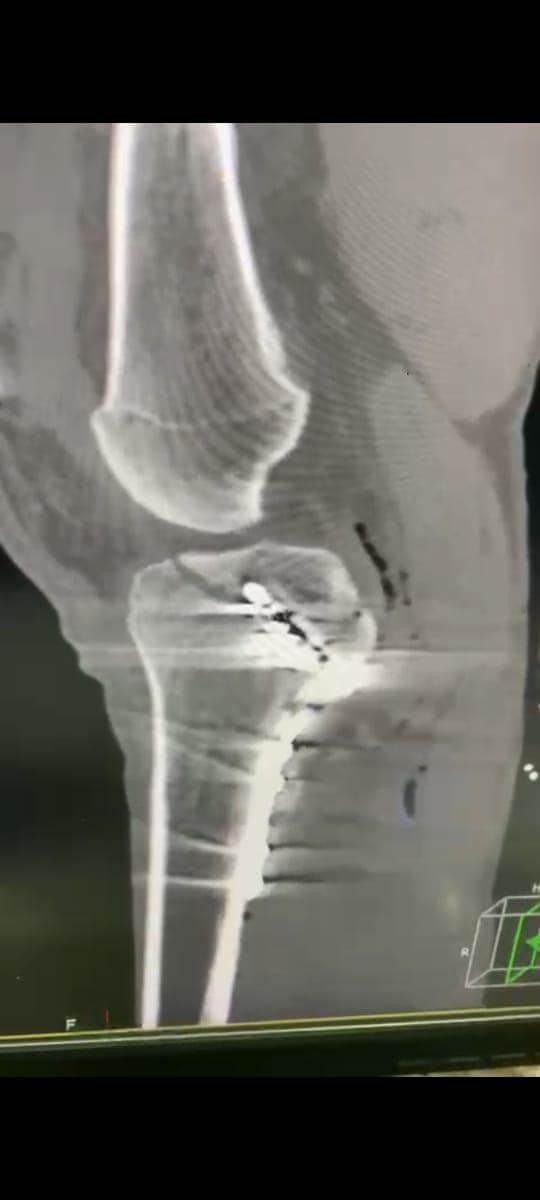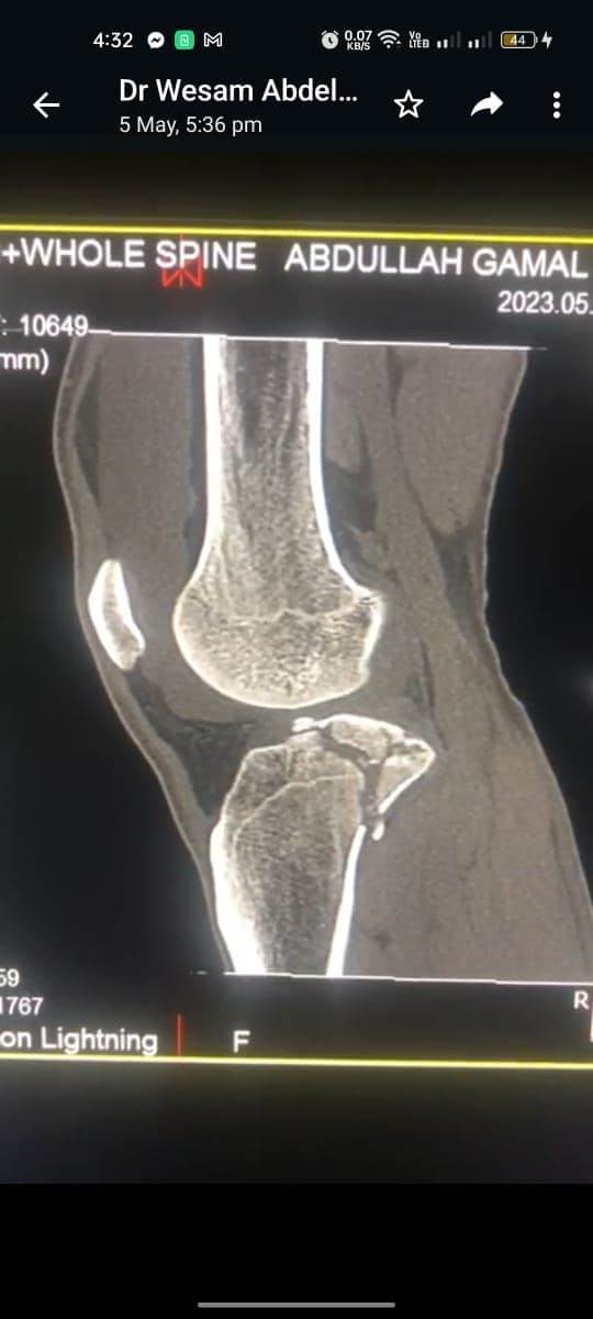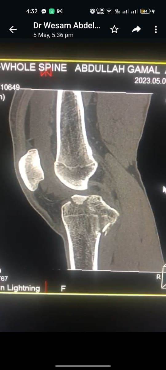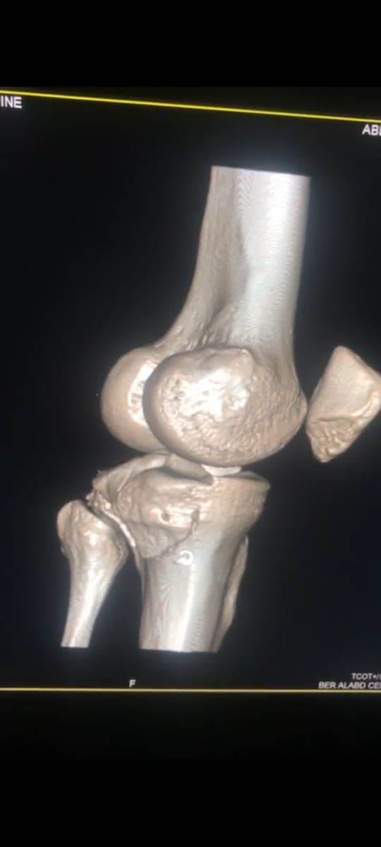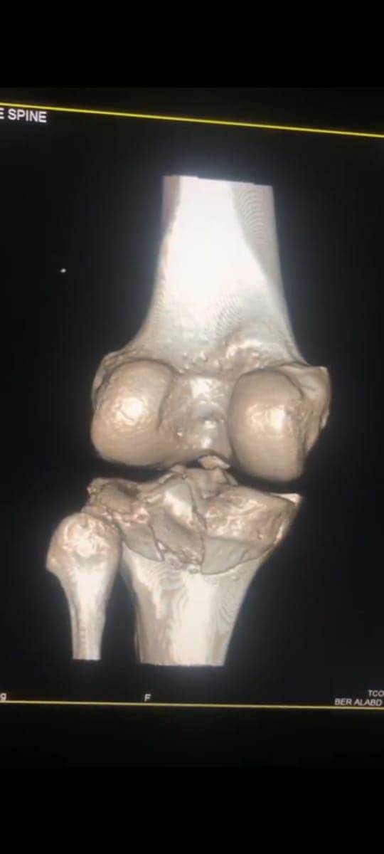 وأضاف أنه نظرًا لقرب هذا الكسر من سطح المفصل تم عمل أشعة مقطعية بعد الجراحة للتأكد من جودة بناء المفصل وعدم وجود أى بروز للمسامير داخل المفصل، وجارٍ تحضير المريض لعمل رنين مغناطيسى لتحديد الأربطة الداخلية والخارجية للركبة التي ستحتاج لإعادة بناء بالمنظار.