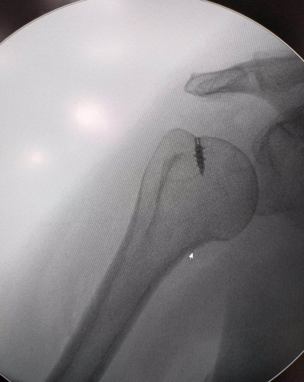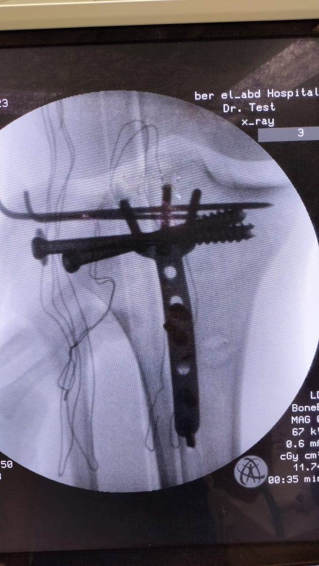 مشيرًا الى أن ذلك النوع من الكسور يكون قريبًا جدًا من الأعصاب والأوعية الدموية الرئيسية للساق والتي توجد خلف مفصل الركبة.. حيث تم الوصول الى الكسر وإعادة بناء سطح المفصل وتثبيته باستخدام شريحة ومسامير وأسلاك معدنية باستخدام جرح ٧ سنتيمترات خلف الركبة واستخدام مسامير جانبية مجوفة بدون فتح لتثبيت الجزء الخارجى من سطح المفصل، وتم الاطمئنان على الأوعية الدموية قبل إفاقة المريض، وبعد تمام الإفاقة.. تم الاطمئنان على الأعصاب والأوعية للمريض.