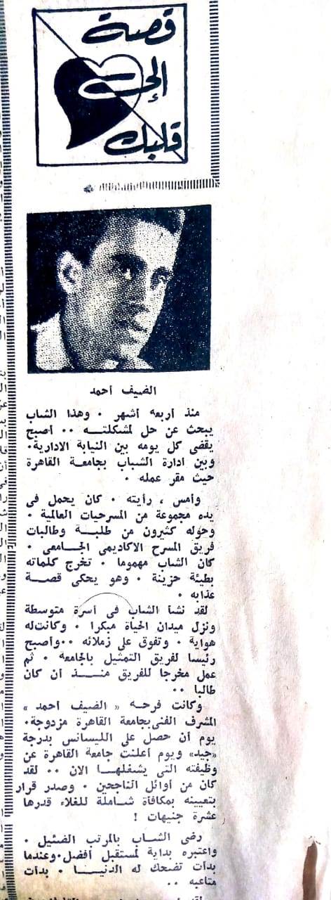 سطور هذه القصة حدثت بالفعل قبل 60 عامًا، وكان بطلها الكوميديا الراحل الضيف أحمد، مؤسس ونجم فرقة "ثلاثي أضواء المسرح"، كما رواها الكاتب الصحفي الراحل محمود عارف "توفي في أكتوبر 2016"، عبر عموده الثابت “قصة إلى قلبك”، على صفحات جريدة "أخبار اليوم" في 14 فبراير عام 1963، وكان وقتها الفنان الشاب قد أتم عامه السابع والعشرين.