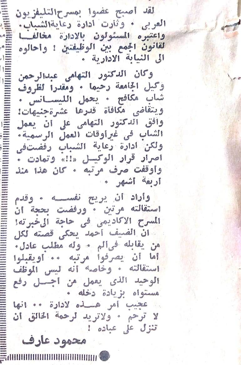 عاصر "عارف" أزمة نجم فرقة "ثلاثي أضواء المسرح"، وهو في بداية مشواره الفني الجامعي - قبل الاحتراف - ليرصدها عبر جريدة أخبار اليوم، عله يجد آذانًا صاغية، تساعد في إيجاد حل لمشكلة هذا الشاب اليافع، الذي لم يكن لديه أي مصدر آخر للدخل، يعينه على مصاعب ومتطلبات الحياة.