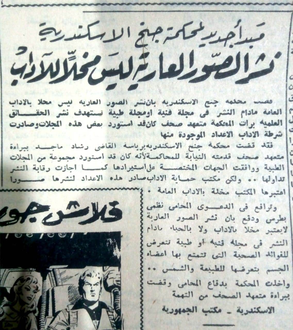 وأمام محكمة جنح الإسكندرية، ترافع المحامي نظمي بطرس عن متعهد المجلات، ودفع ببطلان إجراءات الضبط، مطالبًا بإسقاط جميع التهم الموجهة إلى موكله، مؤكدًا بأن نشر الصور العارية لا يعتبر مخلًا بالآداب العامة والحياء، ولا خروجًا على القانون المنظم لهذا الشأن، ما دام النشر يتم في إطار المجلات الطبية أو الفنية المتخصصة.