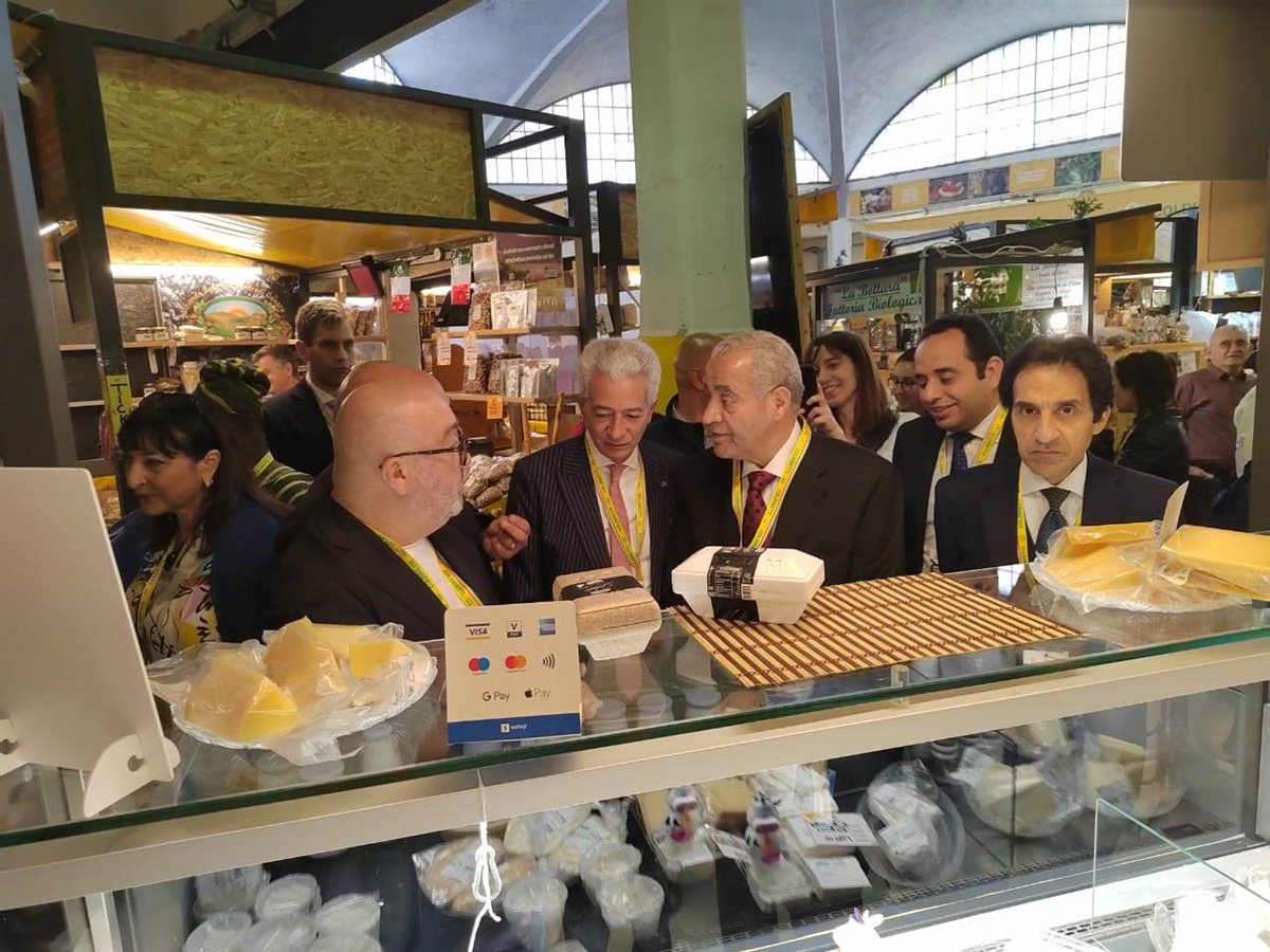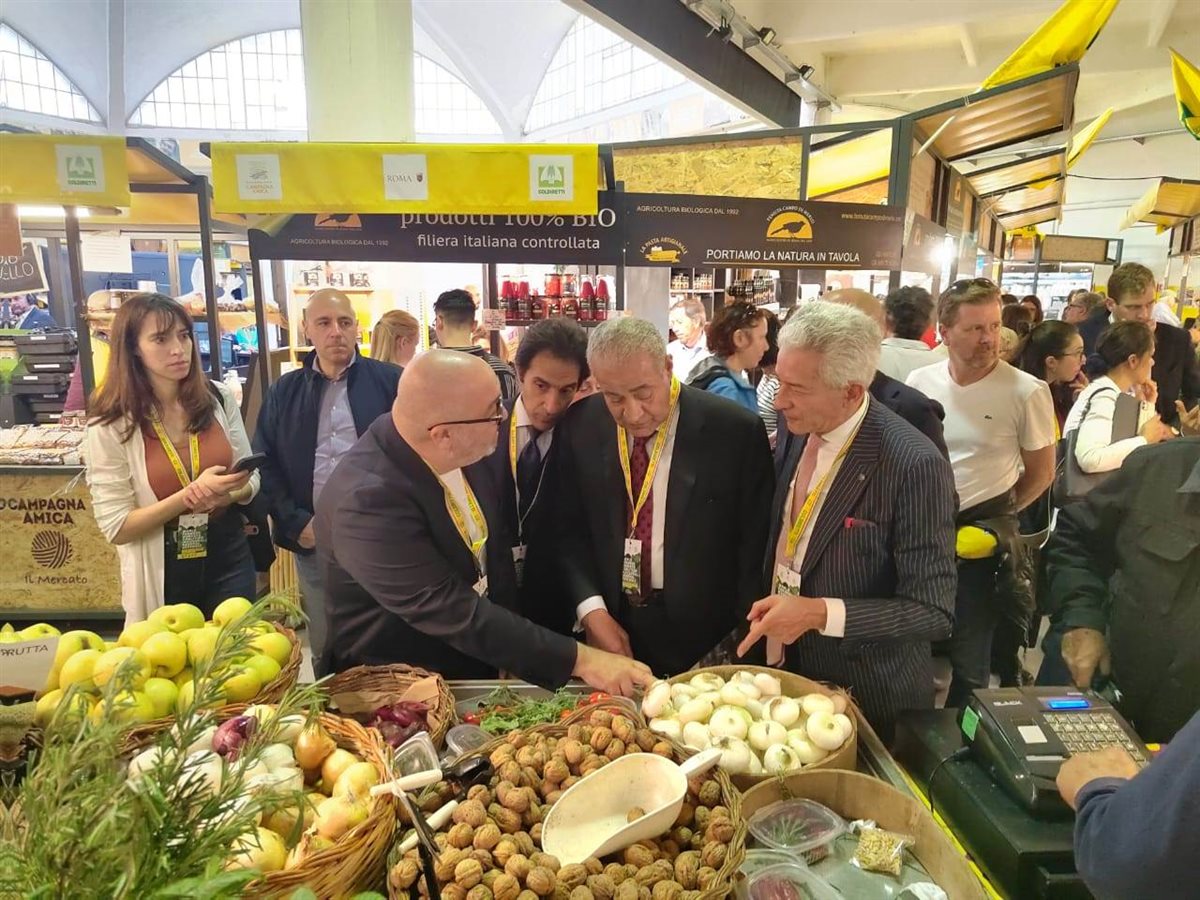 وكان في استقبال الدكتور علي المصيلحي وزير التموين والتجارة الداخلية فور وصوله إلي روما السكرتير العام لاتحاد المزارعين والاتحادات الخاصة بالزراعة والصناعات الغذائية في إيطاليا ومحافظ روما ورئيس اتحاد أسواق المزارعين في إيطاليا ومدير عام اتحاد اسواق الجملة، وكان برفقة الوزير السفير السيد بسام راضي - سفير مصر في إيطاليا والدكتور علاء عز - أمين عام اتحاد الغرف التجارية.