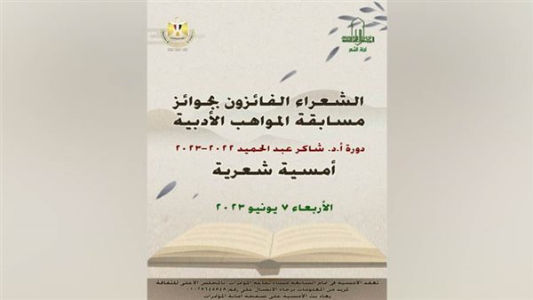 يقيم المجلس الأعلى للثقافة بأمانة الدكتور هشام عزمي، أمسية شعرية للشعراء الفائزين بجوائز مسابقة المواهب الأدبية «دورة الأستاذ الدكتور شاكر عبدالحميد ٢٠٢٢ - ٢٠٢٣»، والتي اقامتها الإدارة العامة للشؤون الأدبية بالأمانة العامة للمجلس الأعلى للثقافة، وذلك في تمام السابعة يوم الأربعاء 7 يونيو الحالي 2023، بقاعة المؤتمرات بالمجلس الأعلى للثقافة.