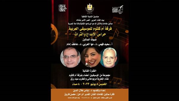يقام الصالون هذا الشهر تحت عنوان فرقة أم كلثوم للموسيقى العربية "حراس الإبداع والتراث" بحضور عدد من أعضائها، ويستضيف الصالون د. مها العربي أستاذة آلة القانون، د. عاطف إمام أستاذ آلة الناي، ود. سعيد فهمي أستاذ آلة الكمان، والحديث حول تاريخ الفرقة ونشأتها والدور الذي قامت به في تقديم التراث الموسيقى وأهم الأعضاء والنجوم التي قادت الفرقة، يتخلل الصالون فقرات غنائية للفنانة مريم هاني والفنان سيد رزق . الصالون إعداد وتقديم د. إيناس جلال الدين، والفكرة للراحل الفنان الكبير محسن فاروق.