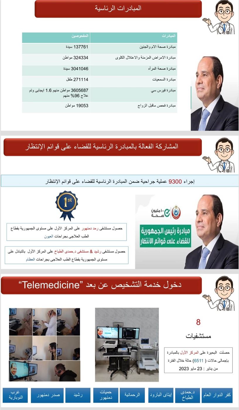 وأضاف الجزار، ان مديرية الصحة بالبحيرة نفذت العديد من المبادرات الرئاسية برعاية الرئيس عبد الفتاح السيسي منها مبادرة 100 مليون صحة حيث تم فحص جميع المواطنين وكانت نسبة الإيجابي من الحالات 4.6% ومبادرة علاج الأنيميا والسمنة وقصر القامة حيث تم فحص 81485 مواطنا منهم 23455 حالة إيجابية والخطة القومية للقضاء على فيروس سي والكشف عن الأمراض غير السارية.