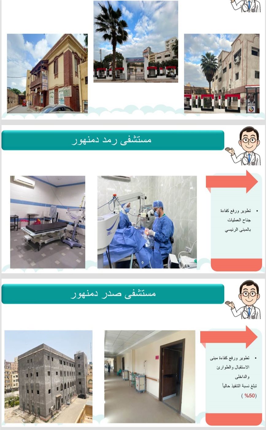 كما تم وضع حجر الأساس لمبنى مستشفى الجامعة وكلية الطب بجامعة دمنهور على مساحة 4500م بتكلفة تتجاوز مليارًا و250 مليون جنيه عبارة عن أرضي و9 أدوار علوية وتضم 500 سرير بأعلى المعايير الدولية، وتم بدء العمل في تنفيذ المشروعين لينضموا إلى المنظومة الصحية والصروح الطبية بالمحافظة لتقديم الخدمات العلاجية المميزة للمواطنين.