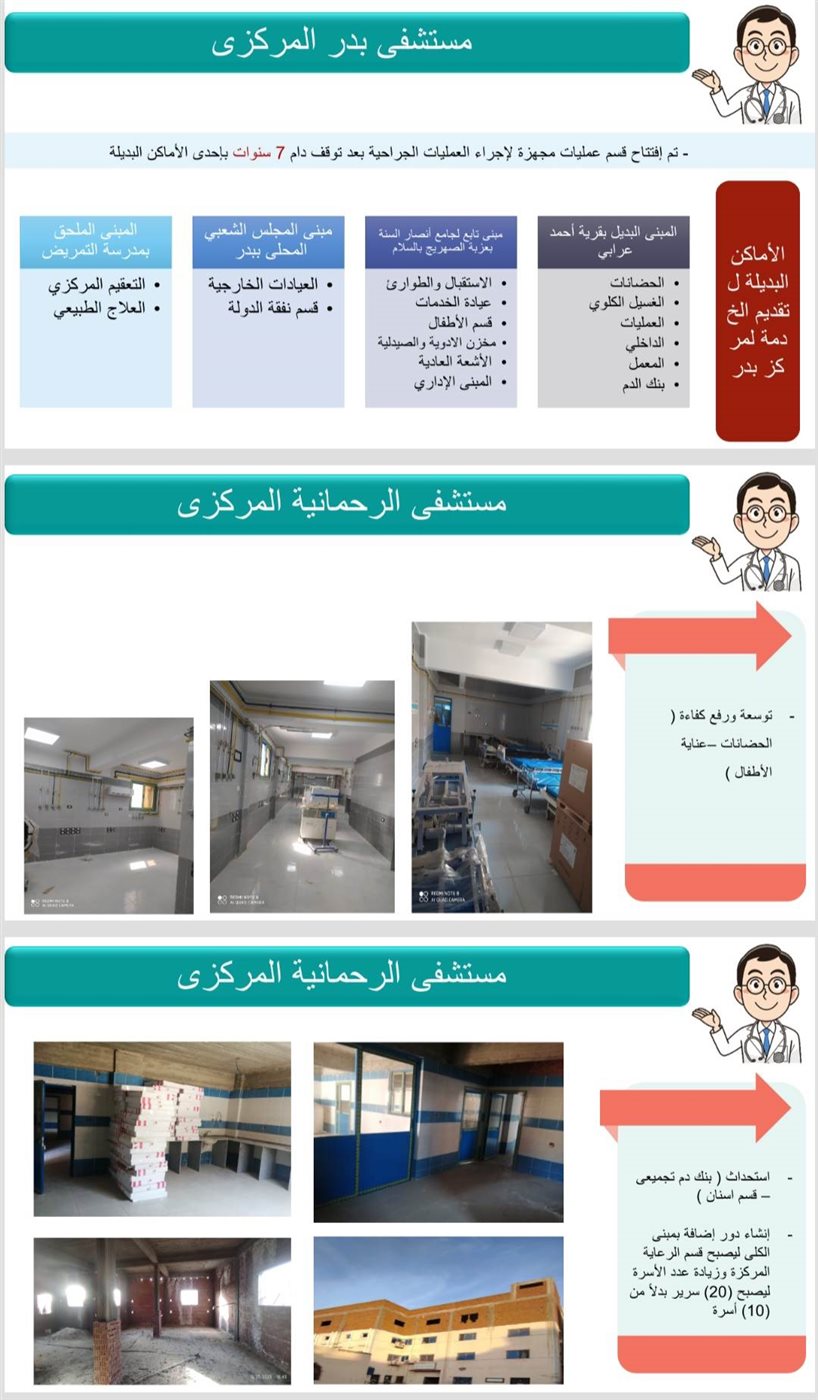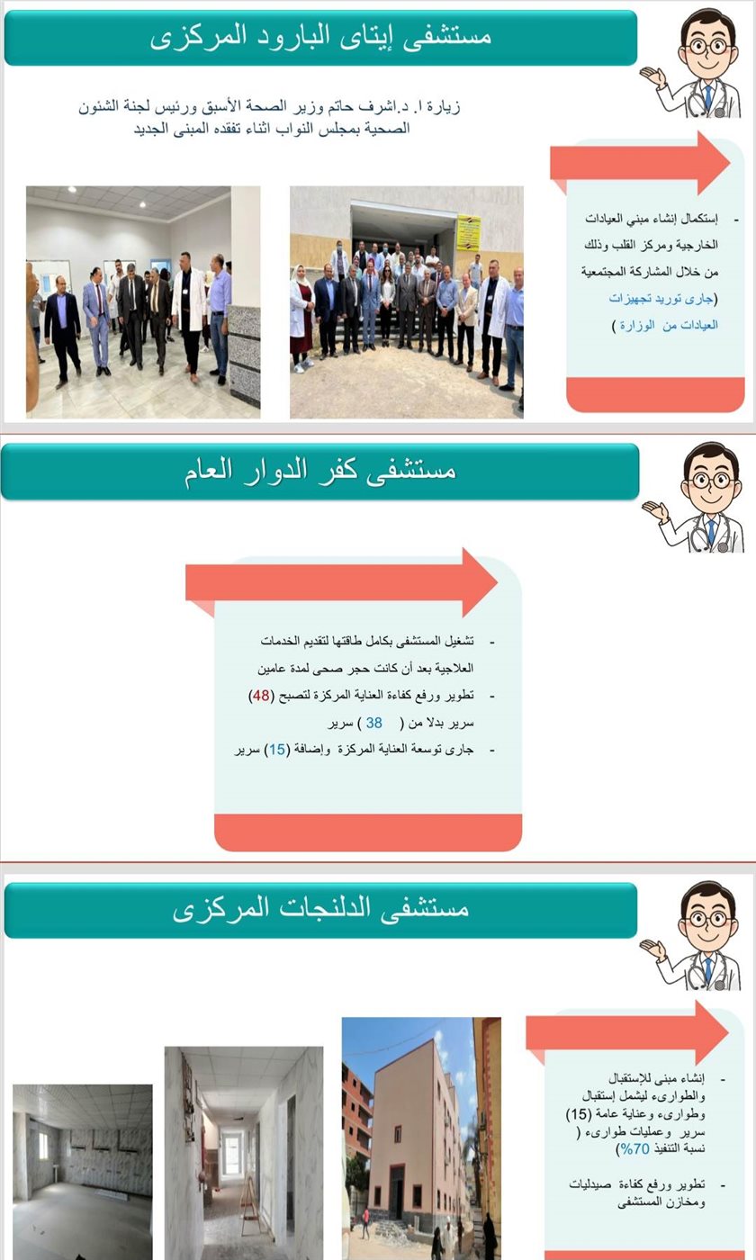 وأوضح الدكتور هاني جميعة، أنه تم تنفيذ 21 مشروعا في قطاع الصحة بلغت تكاليفها الإجمالية 614 مليونا و75 ألف جنيه عبارة عن 6 مشروعات لإحلال وتجديد "مستشفى كوم حمادة بتكلفة 220 مليونا، مستشفى بدر المركزي بتكلفة 108 ملايين جنيه، مستشفى أبو حمص المركزي "مركزيًا بمعرفة الوزارة"- طوارئ التوفيقية بتكلفة 170 مليون جنيه ومجمع الأمراض المتوطنة بتكلفة 16 مليونا و75 ألف جنيه ومركز طبي حوش عيسى "بتمويل من الوزارة"، كما تم الانتهاء من 12 مشروع تطوير وإنشاء وحدات صحية بتمويل من الوزارة ومشروع إنشاء مبنى بمستشفى إيتاي البارود على مساحة 2000 متر بتكلفة 7 ملايين جنيه، مشيرا إلى تفعيل دور المشاركات المجتمعية بالمستشفيات المركزية وإنشاء مباني وتوريد تجهيزات طبية وعمل إحلال وتجديد وتطوير لأقسام المستشفيات بتكلفة 69 مليونا و594 ألف جنيه.