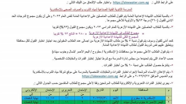 أعلنت شركة مياه الشرب بالإسكندرية، عبر صفحتها على التواصل الاجتماعي فيسبوك عن قبول دفعة جديدة من الطلاب المصريين الحاصلين على الشهادة الإعدادية العامة والأزهرية دور أول “بنين” فقط عام 2023م، وذلك بالمدرسة الثانوية الفنية الصناعية لمياه الشرب والصرف الصحي للبنين بالإسكندرية.
