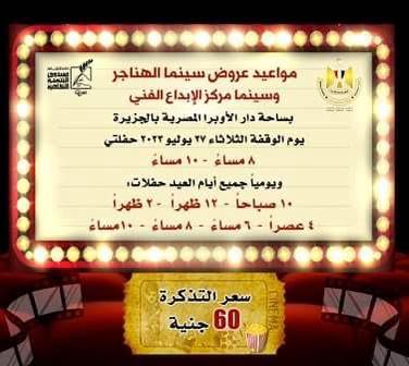 بسينما الهناجر ومركز الإبداع احدث الأفلام بأسعار مخفضة في عيد الأضحى تبدأ ولأول مرة عروض أحدث الأفلام السينمائية بأسعار مخفضة بسينما الهناجر وسينما مركز الإبداع الفني، بساحة دار الأوبرا المصرية، التابعتين لقطاع صندوق التنمية الثقافية، وذلك تزامنًا مع الاحتفال بعيد الأضحى المبارك.