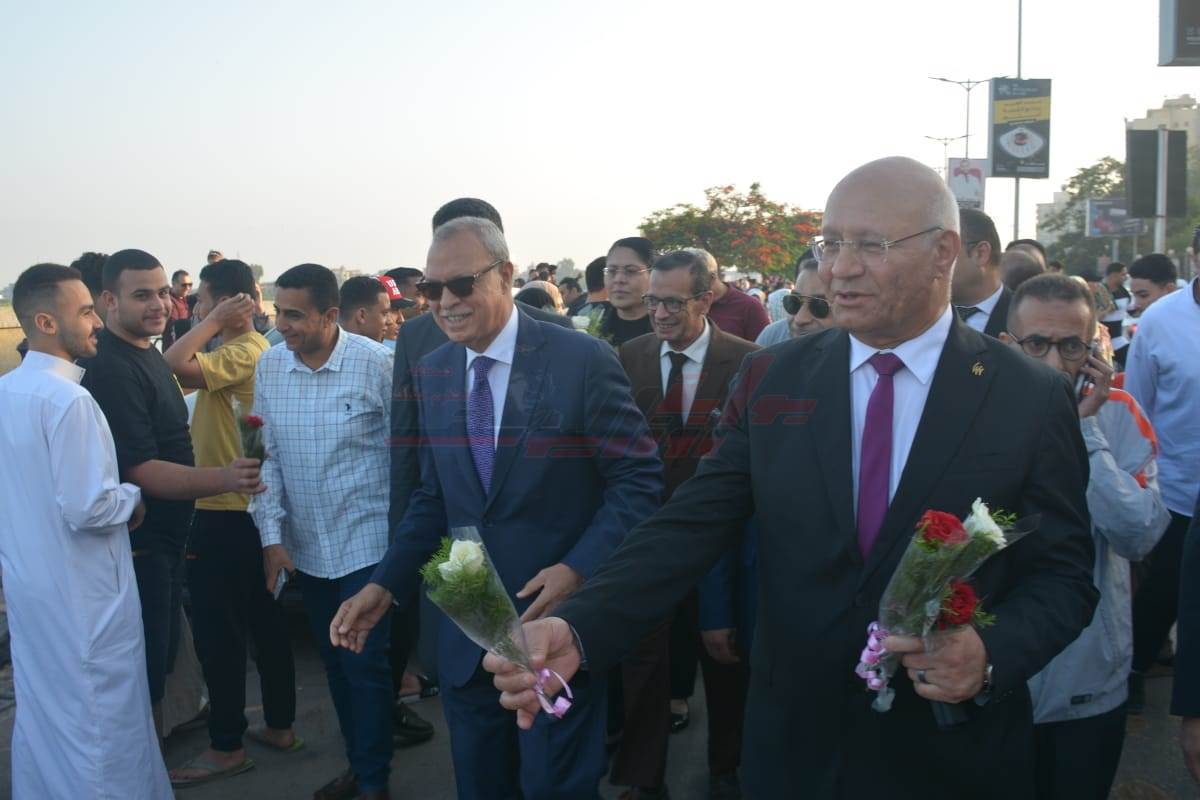 محافظ القليوبية ورئيس الجامعة يوزعان الورود على المحتفلين بكورنيش بنها