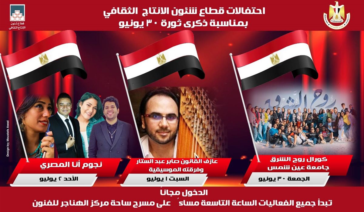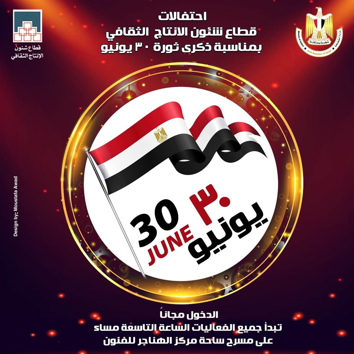 تحت رعاية الدكتورة نيفين الكيلاني، وزيرة الثقافة، يحتفل قطاع شؤون الإنتاج الثقافي برئاسة المخرج خالد جلال، بذكرى ثورة 30 يونيو، في الفترة من 30 يونيو الجاري حتى 5 يوليو المقبل 2023، على مسرح ساحة مركز الهناجر للفنون.