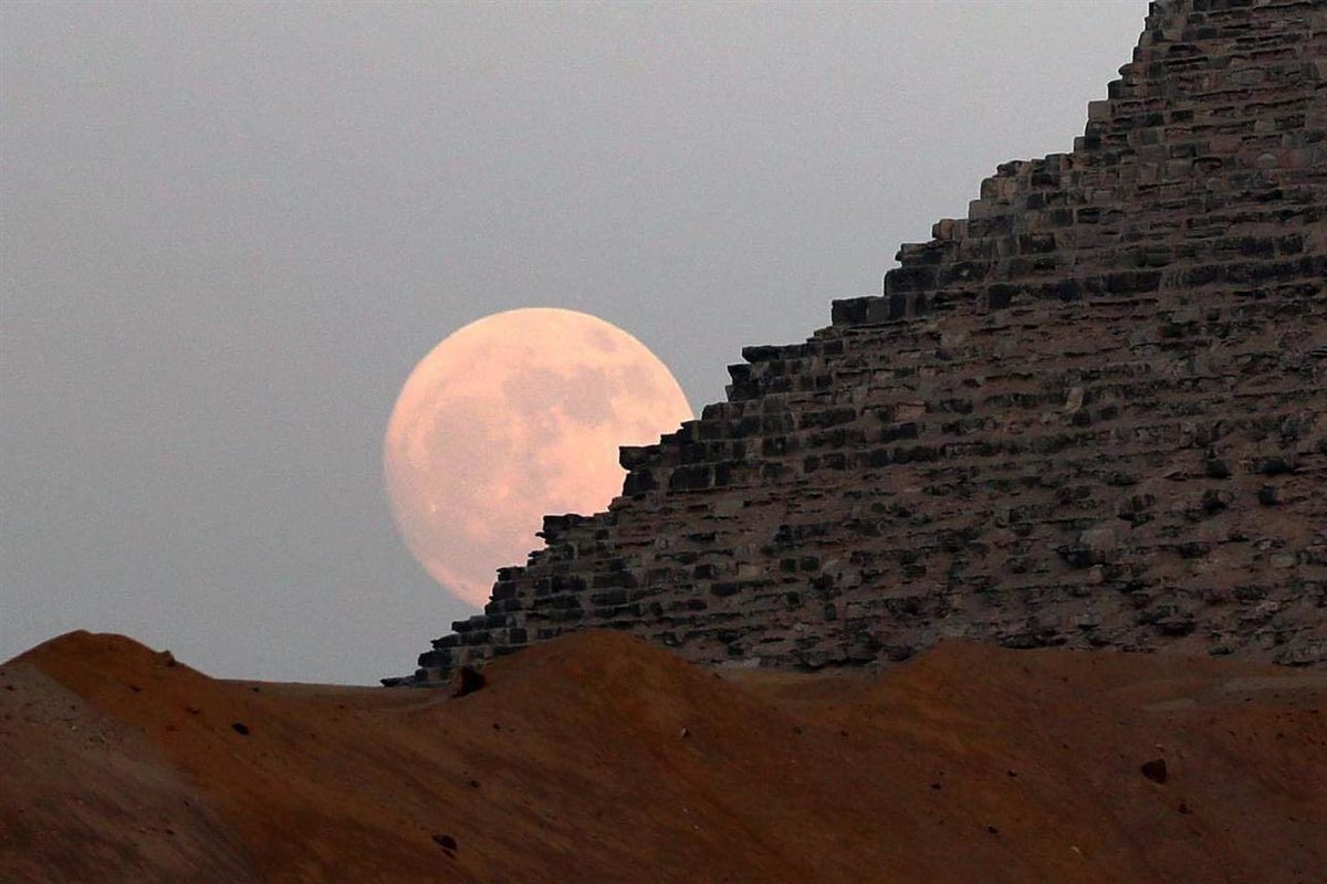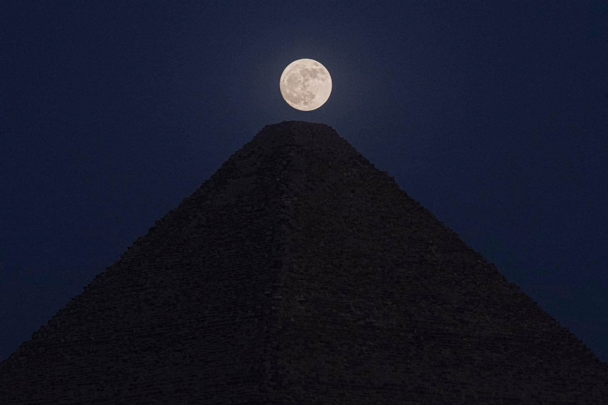مثل التاج على رأس الملوك، جلس البدر مكتمل التمام، على رأس هرم مصر، رمز حضارتها خوفو، وكأنها بشارة قمر يضيء مستقبل الوطن.
