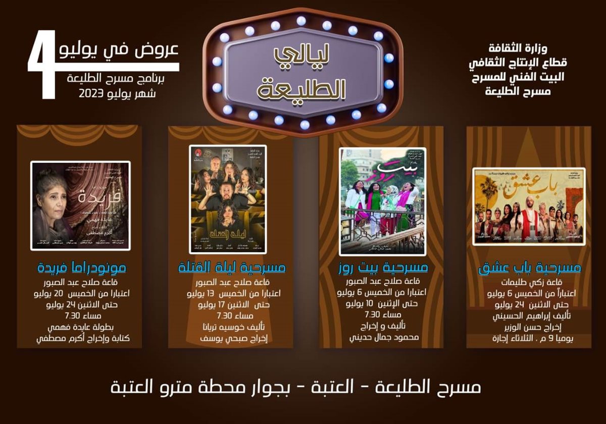 استمرارا للحراك الفني الذي تشهده مسارح الدولة، يقدم البيت الفني للمسرح، برئاسة المخرج خالد جلال رئيس قطاع شؤون الإنتاج الثقافي والقائم بأعمال رئيس البيت الفني للمسرح، من خلال فرقة مسرح الطليعة برئاسة المخرج عادل حسان، بعرض 4 مسرحيات خلال شهر يوليو الجاري على خشبة مسرح الطليعة بالعتبة.