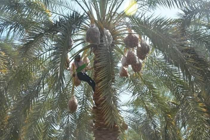 وأوضح المهندس عماد محمد بحر مدير إدارة المكافحه بمديرية الزراعة بالوادى الجديد، لـ"بوابة روزاليوسف"، أن الفترة الحالية تشهد بدء مرحلة التكييس أو التكميم أو زماط عراجين البلح بالمسمى الواحاتي، وهي من أهم المراحل التي تجرى على رأس النخلة لضمان جودة وتحسين وسلامة التمور والحفاظ على ثمار البلح، وهي المرحلة الخامسة التي تمر بها النخلة حتي حصاد المحصول، ويتم تنفيذ هذه العملية في بداية مرحلة تلوين الثمار باستخدام أكياس البولي إيثيلين المثقبة.