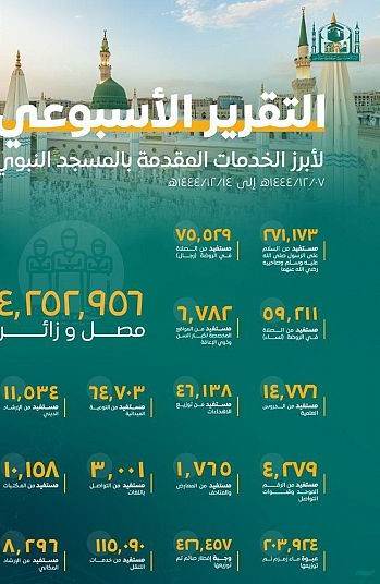 أعلنت وكالة رئاسة المسجد النبوي، اليوم، من خلال تقريرها الأسبوعي، أنها أستقبلت خلال الفترة من 7 إلى 14 من شهر ذي الحجة لعام 1444هـ، أكثر 4 ملايين و252 ألف مصل وزائر.