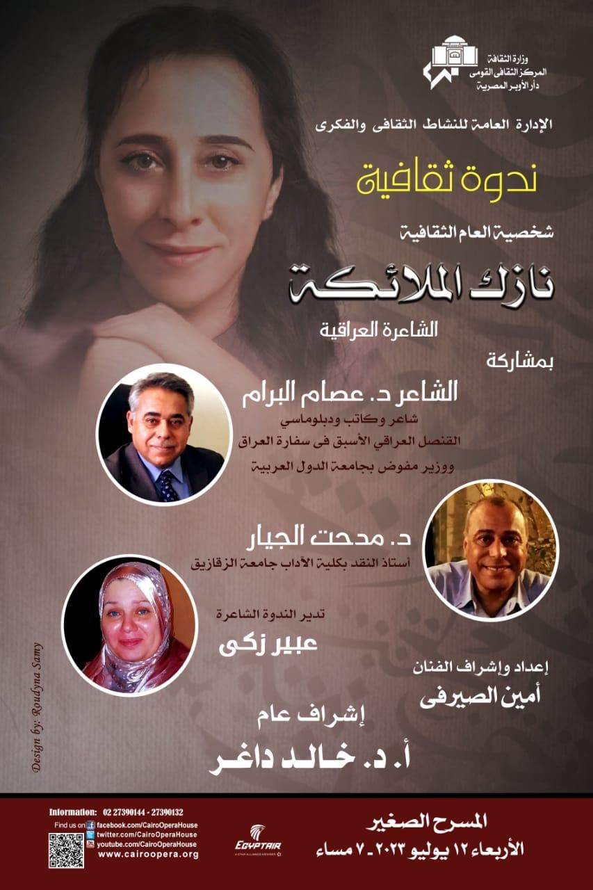 تنظم دار الأوبرا المصرية برئاسة الدكتور خالد داغر، ندوة ثقافية تحتفل خلالها بمئوية ميلاد الشاعرة العراقية الشهيرة نازك الملائكة وتستضيف مواطنها الشاعر الدكتور عصام البرام، الدكتور مدحت الجيار مع ضيوف الشرف الدكتور حسن طلب، الدكتور رامي هلال والدكتور عبدالقادر الحصنى وتديرها الشاعرة عبير زكى ويتخللها عدد من الفقرات الفنية، وذلك في السابعة مساء الأربعاء 12 يوليو على المسرح الصغير.
