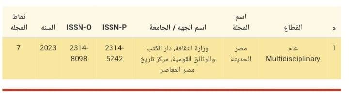 حققت مجلة مصر الحديثة، إحدى إصدارات دار الكتب والوثائق القومية، إنجازا علميا جديدا، حيث حصلت على ٧ درجات في تقييم المجلات العلمية المصرية لعام ٢٠٢٣ وهي الدرجة الأعلى في التقييم.