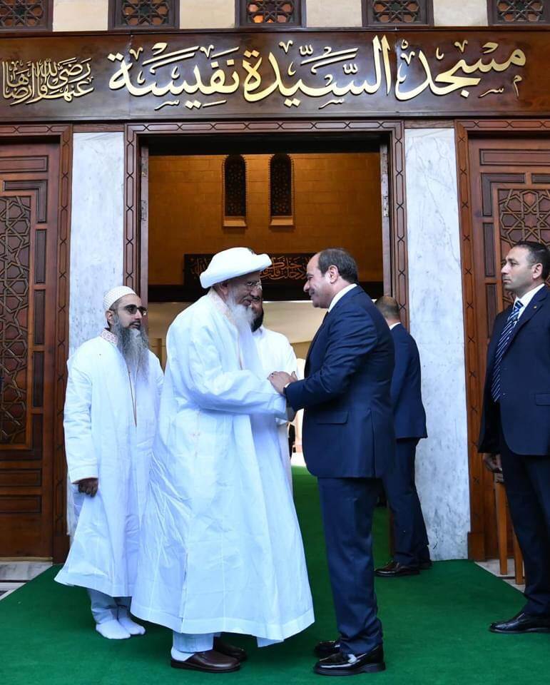 افتتح الرئيس عبد الفتاح السيسي، اليوم الثلاثاء، أعمال تطوير وترميم مسجد السيدة نفيسة "رضي الله عنها". بحضور السلطان مفضل سيف الدين، سلطان طائفة البهرة بالهند. وتفقد الرئيس السيسي أعمال تطوير المقصورة بالمسجد، وقام بتأدية الصلاة فيه.