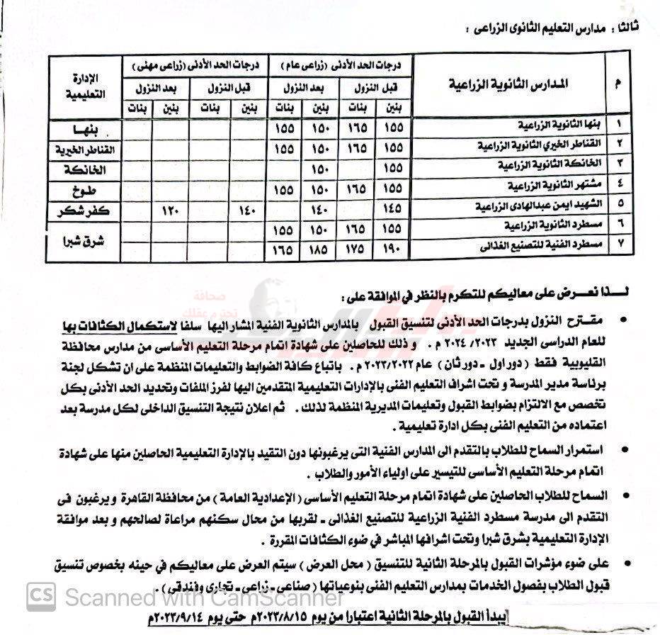 وافق اللواء عبد الحميد الهجان محافظ القليوبية، على النزول بمجموع القبول بالصف الاول الثانوي لـ 215 درجة والخدمات 180 درجة.