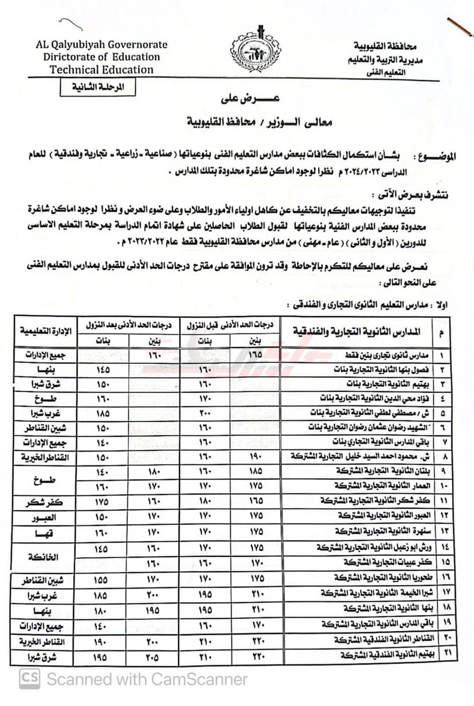 كما وافق محافظ القليوبية، على ما تم عرضه من سماح ابراهيم وكيل وزارة التربية والتعليم بالقليوبية بشأن تخفيض الحد الأدنى للقبول بالصف الاول الثانوي العام للعام الدراسي 2023/2024 ليصبح 215 درجة بدلا من 220 درجة وذلك تيسيرا على أولياء الامور والطلاب مع اتاحه استمرار التقدم للالتحاق بالمدارس الثانوية حرصا على مستقبل الطلاب كما وافق على أن يكون الحد الادنى لتنسيق القبول لمدارس الثانوي العام الخدمات 180 درجة .