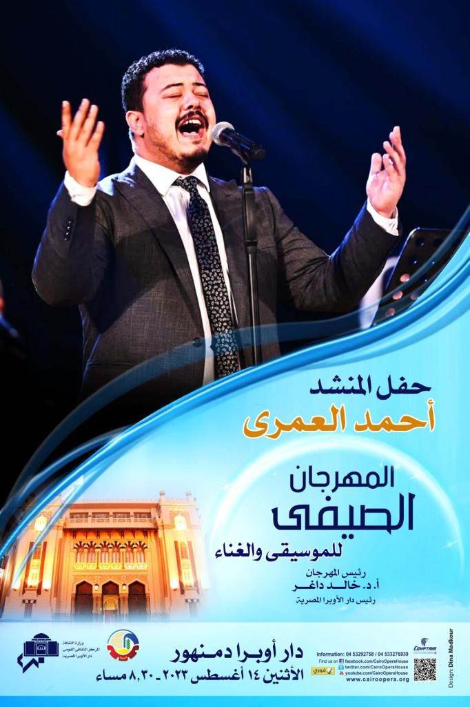 تختتم دار الأوبرا المصرية، برئاسة الدكتور خالد داغر فعاليات المهرجان الصيفي للموسيقى والغناء بمحافظة البحيرة بحفل للمنشد أحمد العمرى وفرقته يُقام في الثامنة والنصف مساء الاثنين 14 أغسطس 2023 بمسرح أوبرا دمنهور.