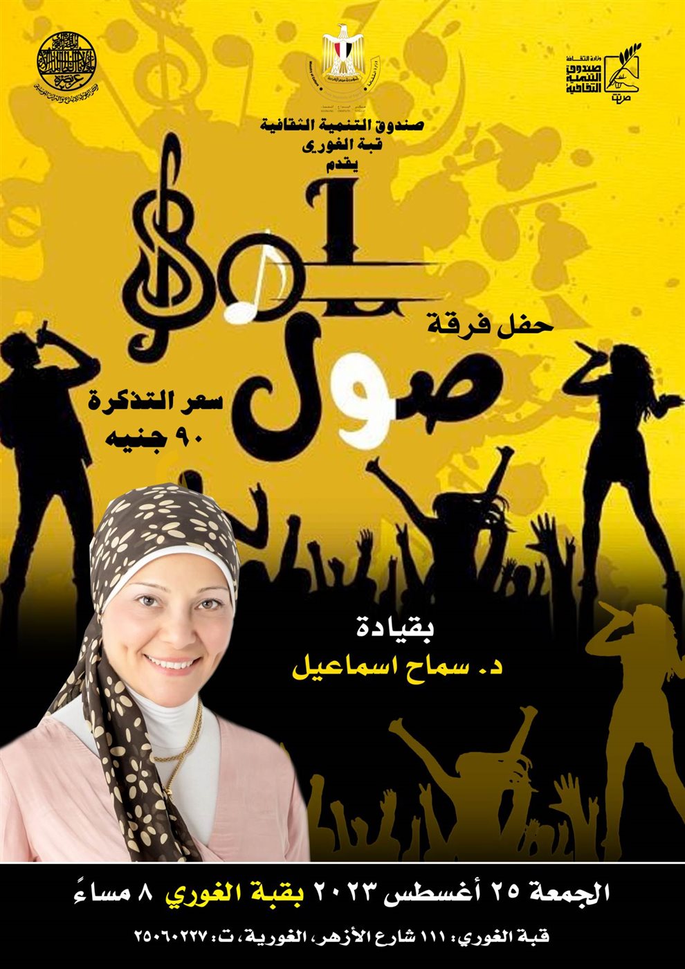 يقيم مركز إبداع قبة الغوري التابع لقطاع صندوق التنمية الثقافية في الثامنة مساء الجمعة 25 أغسطس حفل غنائي لفرقة "صول" يتضمن البرنامج مجموعة متميزة الأغاني منها: "جرحونا برمش عين"، " أهيم شوقا "، "من حبي فيك يا جارى" ،"قلبي دليلي"، "علي اللي جرى" و"أسأل روحك".