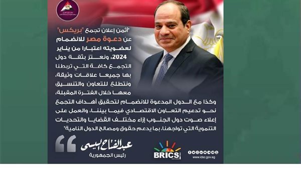 بيان الرئيس عبد الفتاح السيسي، الذي أصدره اليوم الخميس بشأن " إعلان تجمع "بريكس" عن دعوة مصر للانضمام لعضويته اعتبارا من يناير.