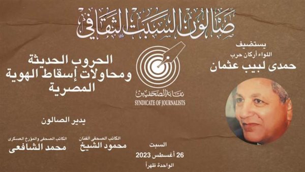 ضمن نشاط الثقافي بنقابة الصحفيين، وتحت عنوان "الحروب الحديثة ومحاولات إسقاط الهوية المصرية" تدور ندوة صالون السبت الثقافي بنقابة الصحفيين المقرر إقامتها في الواحدة بعد ظهر يوم غد السبت المقبل 26 أغسطس الجاري ٢٠٢٣ بقاعة طه حسين الدور الرابع بالنقابة.