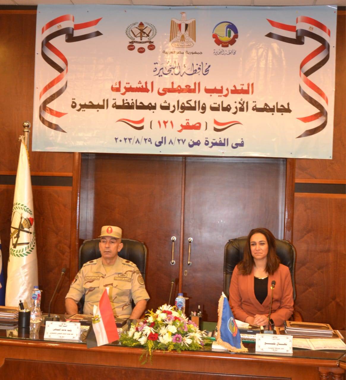 وفى كلمته نقل اللواء أ.ح وليد حامد الحماقي، تحية كل من الفريق أول محمد زكي القائد العام للقوات المسلحة وزير الدفاع والإنتاج الحربي، والفريق أسامة عسكر رئيس أركان حرب القوات المسلحة، ووجه الشكر لنائب محافظ البحيرة لحسن الاستقبال ولجميع الأجهزة التنفيذية بها لما بذلوه من جهد للإعداد الجيد لمشروع التدريب العملي المشترك، مؤكداً على أهمية التدريب للوصول إلى أنسب الأساليب للتعامل مع الأزمات واستغلال الإمكانيات المتاحة للتنسيق بين المحافظة والمحافظات المجاورة والقوات المسلحة للتعامل مع الأزمات ومجابهة الكوراث، كما أكد على أن محافظة البحيرة تعد من أهم محافظات الدلتا لموقعها الجغرافي المتميز وامتلاكها للعديد من الثروات، كما أنها تعد الأولى في مساحة الأراضي المنزرعة وإنتاجها الزراعي المتعدد.
