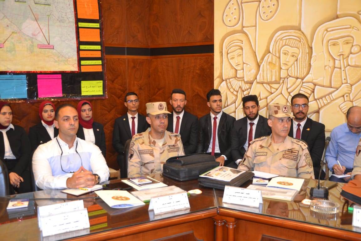 رافق قائد قوات الدفاع الشعبي والعسكري، العميد محمد عبد المالك مساعد قائد قوات الدفاع الشعبي والعسكري، والعميد أ.ح محمد حلمى عبد الدايم - مساعد قائد القوات، والعميد أ.ح أمجد البنا المستشار العسكري للمحافظة، والعميد أ.ح حازم بدر الدين مساعد قائد المنطقة الشمالية العسكرية للأزمات والكوارث، والعقيد أ. ح حمدى هندى مساعد قائد القوات للتدريب والتخطيط.