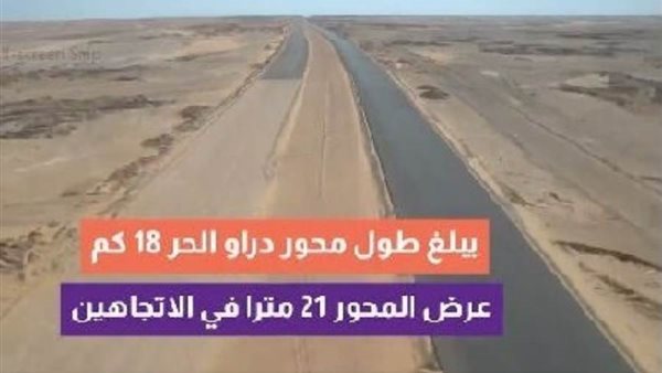 نشر مركز المعلومات ودعم اتخاذ القرار بمجلس الوزراء، اليوم الجمعة، “فيديوجرافًا”، يتضمن تنفذ وزارة النقل أعمال محور دراو الحر التنموي في محافظة أسوان لربط الطريق الزراعي الشرقي "القاهرة ـ أسوان" حتى الطريق الصحراوي الغربي "القاهرة – أسوان" عابرا نهر النيل والطريق الزراعي الغربي "القاهـرة ـ أسوان" .