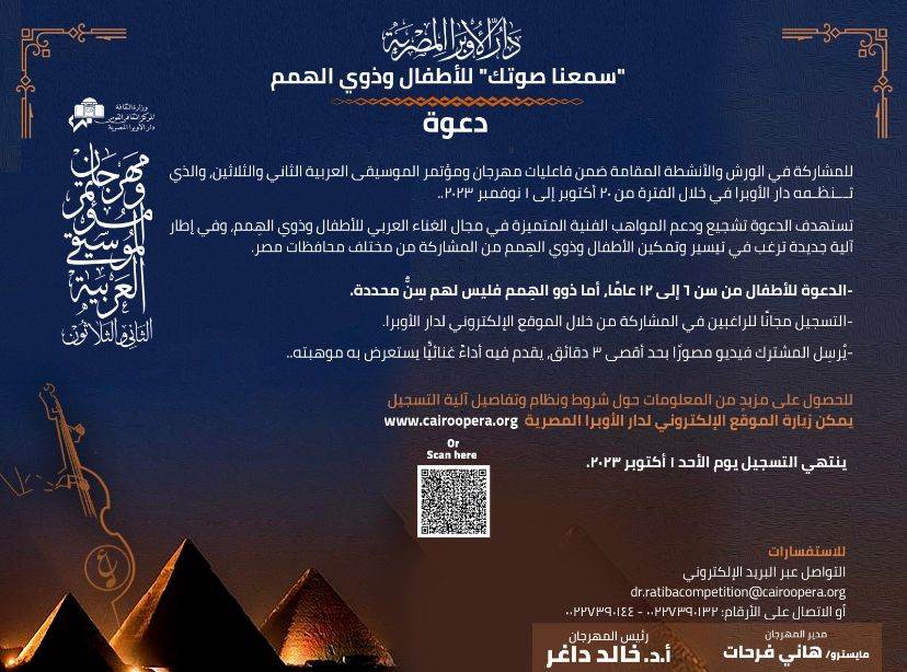 وجه مهرجان ومؤتمر الموسيقى العربية الـ32 والذي تنظمه دار الأوبرا المصرية برئاسة الدكتور خالد داغر ويديره المايسترو هانى فرحات الدعوة للاطفال وذوى الهمم من أصحاب المواهب فى مجال الغناء العربي، للمشاركة فى الفعاليات المقامة خلال الفترة من 20 أكتوبر حتى 1 نوفمبر المقبل.