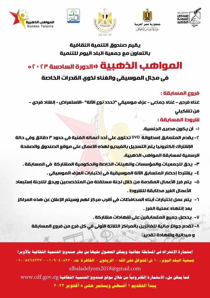 تسلم أعمال المشاركين فى فى جميع فروع مسابقة المواهب الذهبية بمقر جمعية البلد اليوم للتنمية فى موعد أقصاه ٨ اكتوبر ٢٠٢٣ والمجال مفتوح لجميع اصحاب الهمم الخاصة للمشاركة فى المسابقة وفق الشروط المرفقة.
