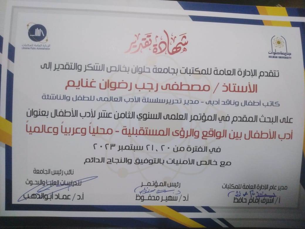 شارك كاتب الاطفال والناقد الأدبى مصطفى غنايم بورقة بحثية بمؤتمر أدب الطفل الثامن عشر بجامعة حلوان بالمحور الخاص بدور المؤسسات الثقافية فى تشجيع الإنتاج الفكرى للأطفال. وعنوان البحث "التعاون بين وزارتى الثقافة والأوقاف.."مشروع رؤية للنشء أنموذجًا".
