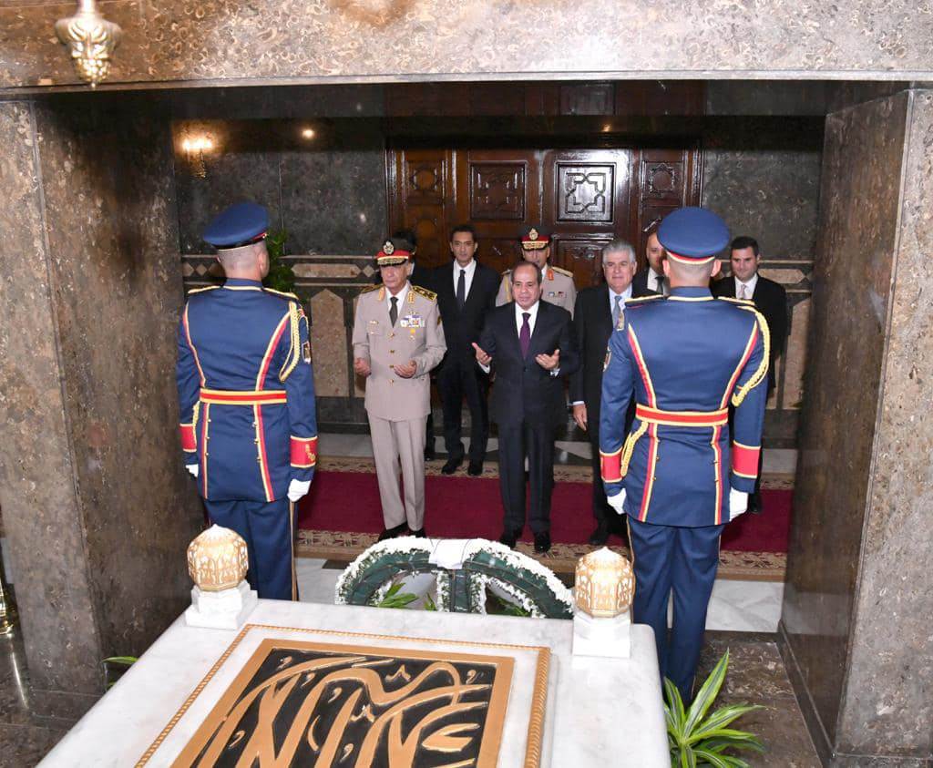 ثم قام الرئيس السيسي بوضع إكليل من الزهور على قبر الرئيس الراحل محمد أنور السادات وقراءة الفاتحة ترحما على روحه الطاهرة، ومصافحة عدد من أفراد أسرته.