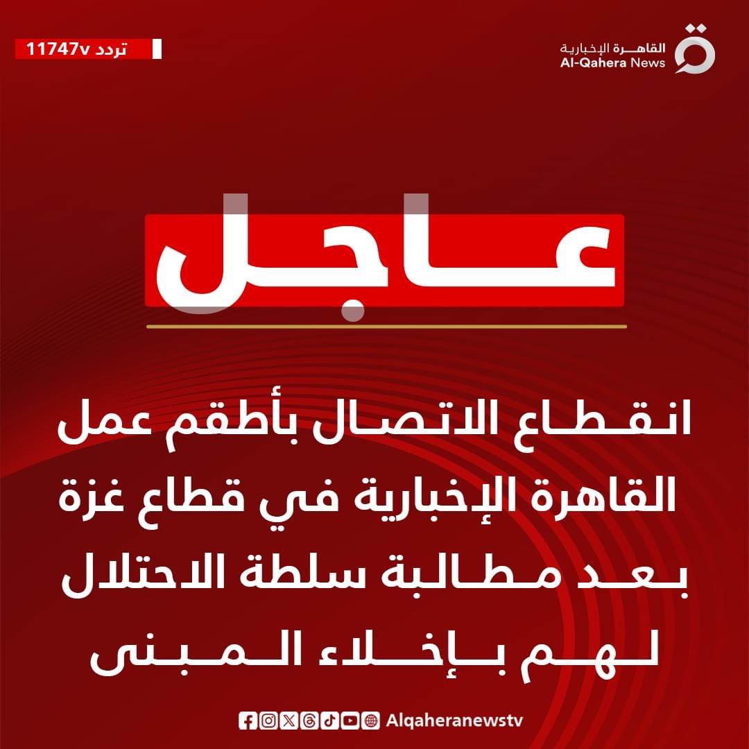 أعلنت قناة القاهرة الإخبارية انقطاع الاتصال بأطقم العمل بقطاع غزه بعد مطالب سلطات الاحتلال بمغادرة المبني وحملت القناة في بيان لها سلطة الاحتلال مسؤولية سلامة كل أطقم عمل القاهرة الإخبارية في قطاع غزة والأراضي الفلسطينية المحتلة.