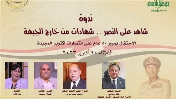 ضمن احتفالات وزارة الثقافة بمرور 50 عاما على انتصارات أكتوبر المجيدة، وتحت رعاية الدكتورة نيفين الكيلاني- وزيرة الثقافة، وبإشراف الدكتور هشام عزمي- الأمين العام للمجلس الأعلى للثقافة، تقام ندوة "شاهد على النصر.. شهادات من خارج الجبهة"، والتي ينظمها المجلس ضمن سلسلة من الفعاليات الثقافية التي ينظمها المجلس على امتداد شهر أكتوبر احتفالا بمرور 50 عاما على انتصارات أكتوبر المجيدة.